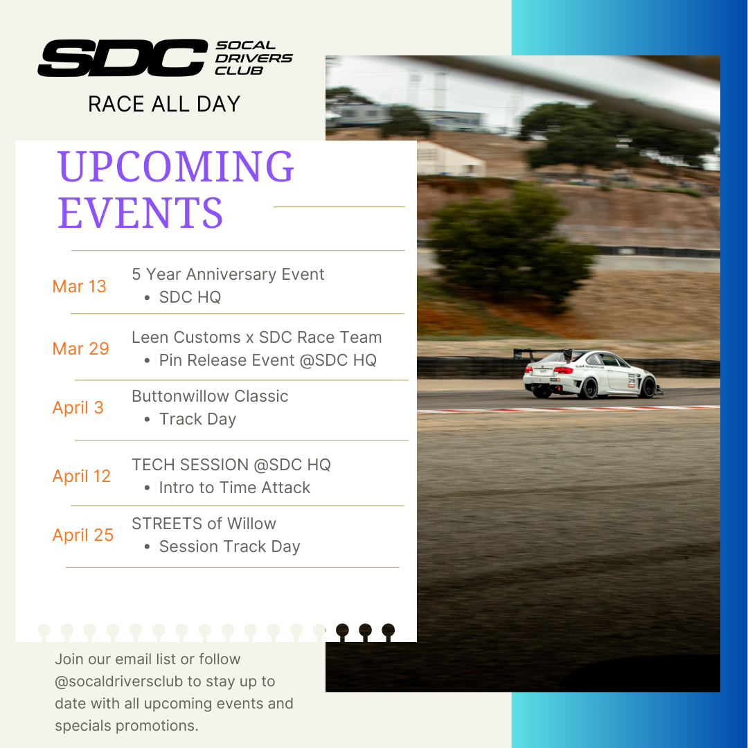 At the core of what we do is community. We’re building a group of enthusiasts who value doing things the right way—safe, respectful, and with proper track etiquette—so everyone can enjoy the experience and keep improving. And now, with our new SDC HQ, we have a home base to bring the community together—hosting events, tech sessions, sim nights, and more both on and off the track.